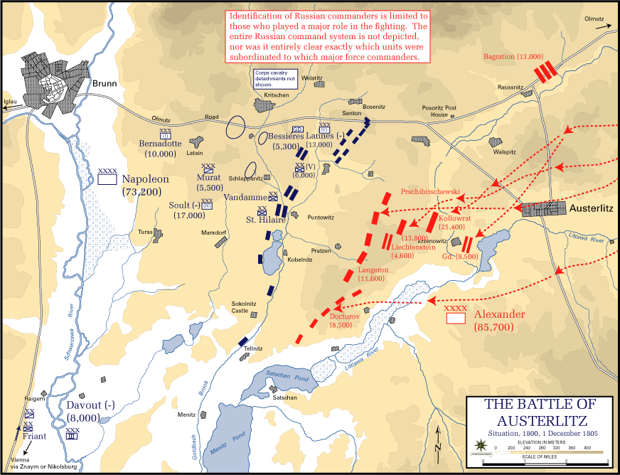 On November 21st Napoleon inspects the terrain to the east of the village of Austerlitz. He is obsessed by details, wants to take note of every particular. He moves around, observes, measures. He studies the maps for a long time , but he only trusts his own eyes. He has 63,000 soldiers against the 85,000 available to its enemies. He knows that a strategic retreat is not an option at that stage and that he needs a decisive victory because his frayed troops might not be able to sustain prolonged confrontation.